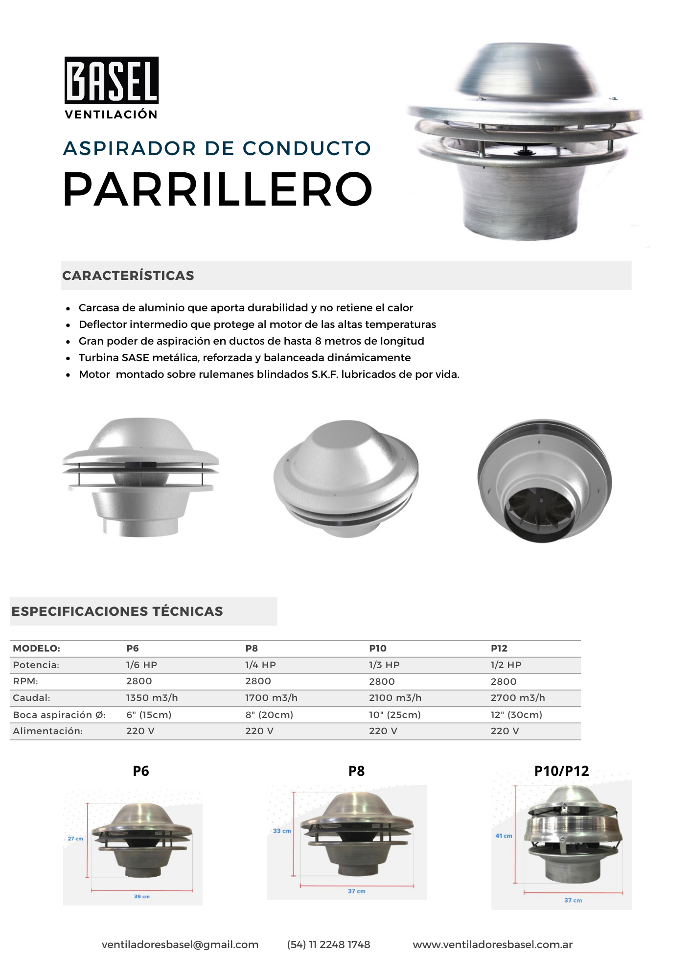 Extractor Parrillero fabricado en Aluminio, deflector medio que protege al motor de las grasas, turbina metálica y motor montado sobre rulemanes SKF. Este extractor se coloca en el exterior apoyado sobre el final de un conducto de ventilación de 6, 8 o 10 pulgadas de diámetro (15, 20 o 25 cm), aspirando desde el interior de una campana gastronómica, sala de máquinas o instalación comercial hacia el exterior en techos y terrazas. Se utiliza para extraer los olores, humos y vapores de parrillas con deficiencia en el tiraje, campanas de instalaciones gastronómicas comerciales y distintas situaciones en las que se necesite extraer vapores de gran temperatura. Cuenta con un deflector que impide que el calor impacte directamente en el motor y está construido en aluminio para garantizar la mayor durabilidad frente a las inclemencias del clima.